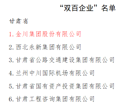 6月20日,國務院國有資產監督管理委員會公布最新“雙百企業”名單,據名單顯示,金川集團股份有限公司入選其中。