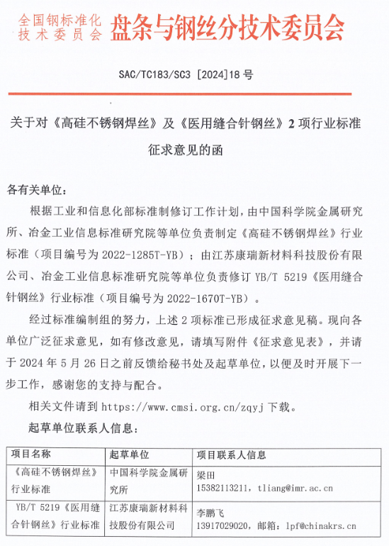 4月25日,由中國科學(xué)院金屬研究所、冶金工業(yè)信息標(biāo)準(zhǔn)研究院等單位負(fù)責(zé)制定《高硅不銹鋼焊絲》行業(yè)標(biāo)準(zhǔn)(項(xiàng)目編號為2022-1285T-YB)已形成征求意見稿。